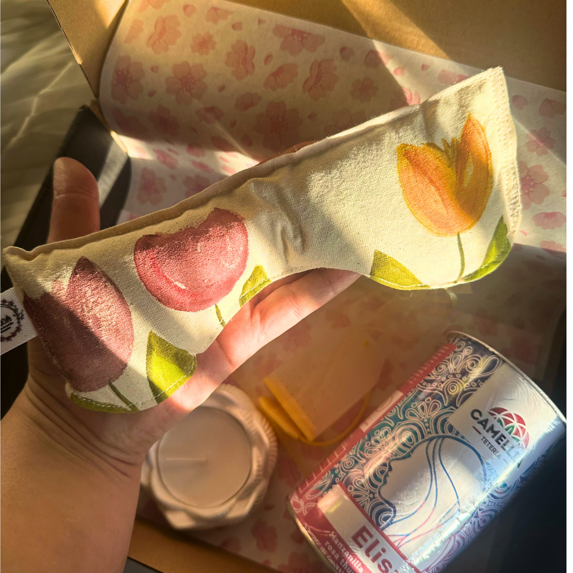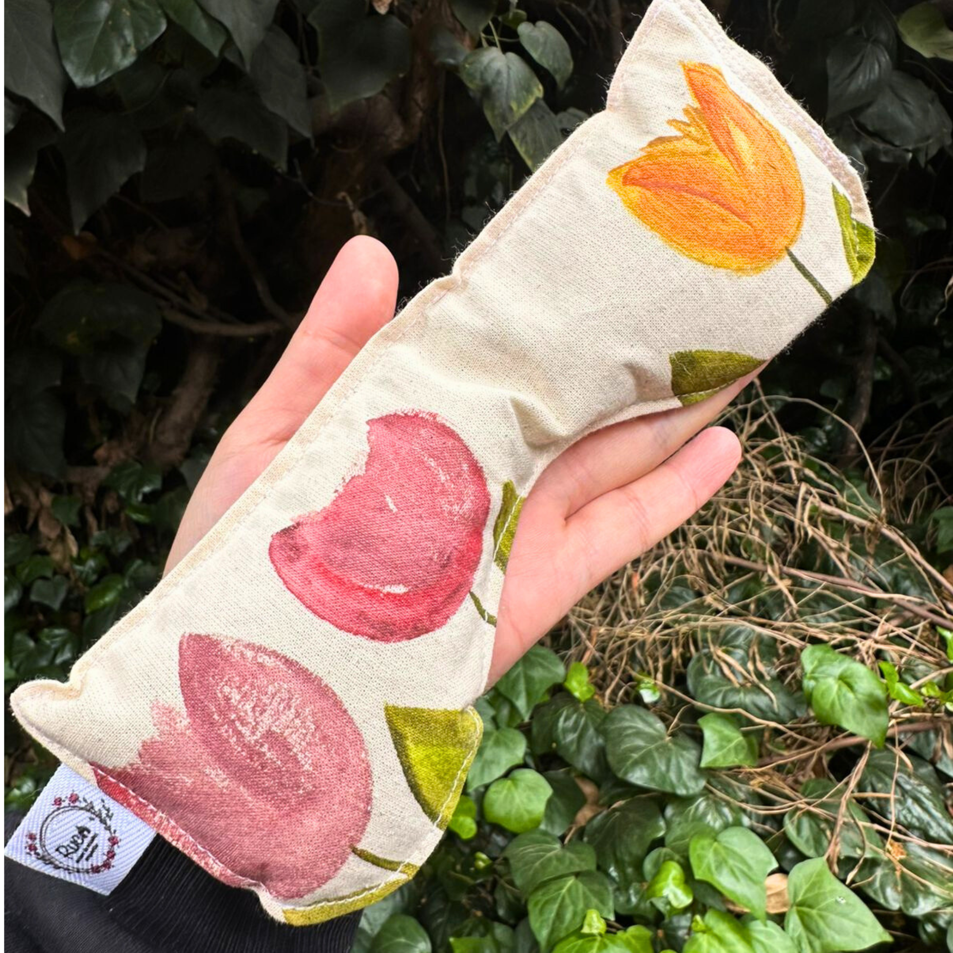 - Antifaz de semillas, hierbas y aceite esencial, acolchado con diseño tulipanes (tela 100% algodón, pintado a mano, usado principalmente para dolor de cabeza, jaqueca, alergia estacional, entre otras)